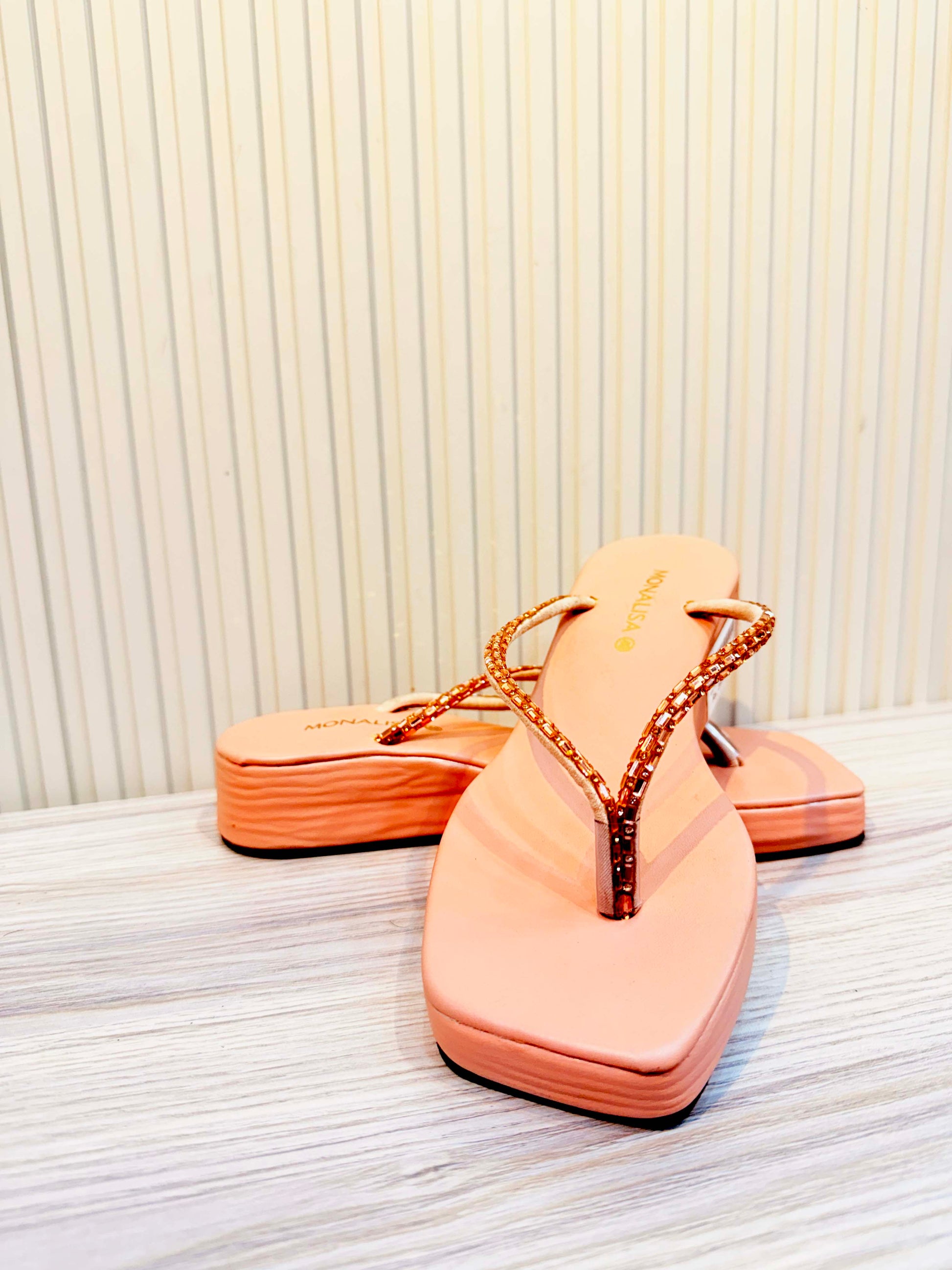 The chic, modern square-toe silhouette is elevated by a sturdy yet lightweight platform sole that provides a comfortable lift. Delicate thong straps are beautifully adorned with sparkling rhinestones, adding a sophisticated shimmer to every step. Crafted in a versatile blush pink, these sandals pair effortlessly with everything from casual jeans to summer dresses.