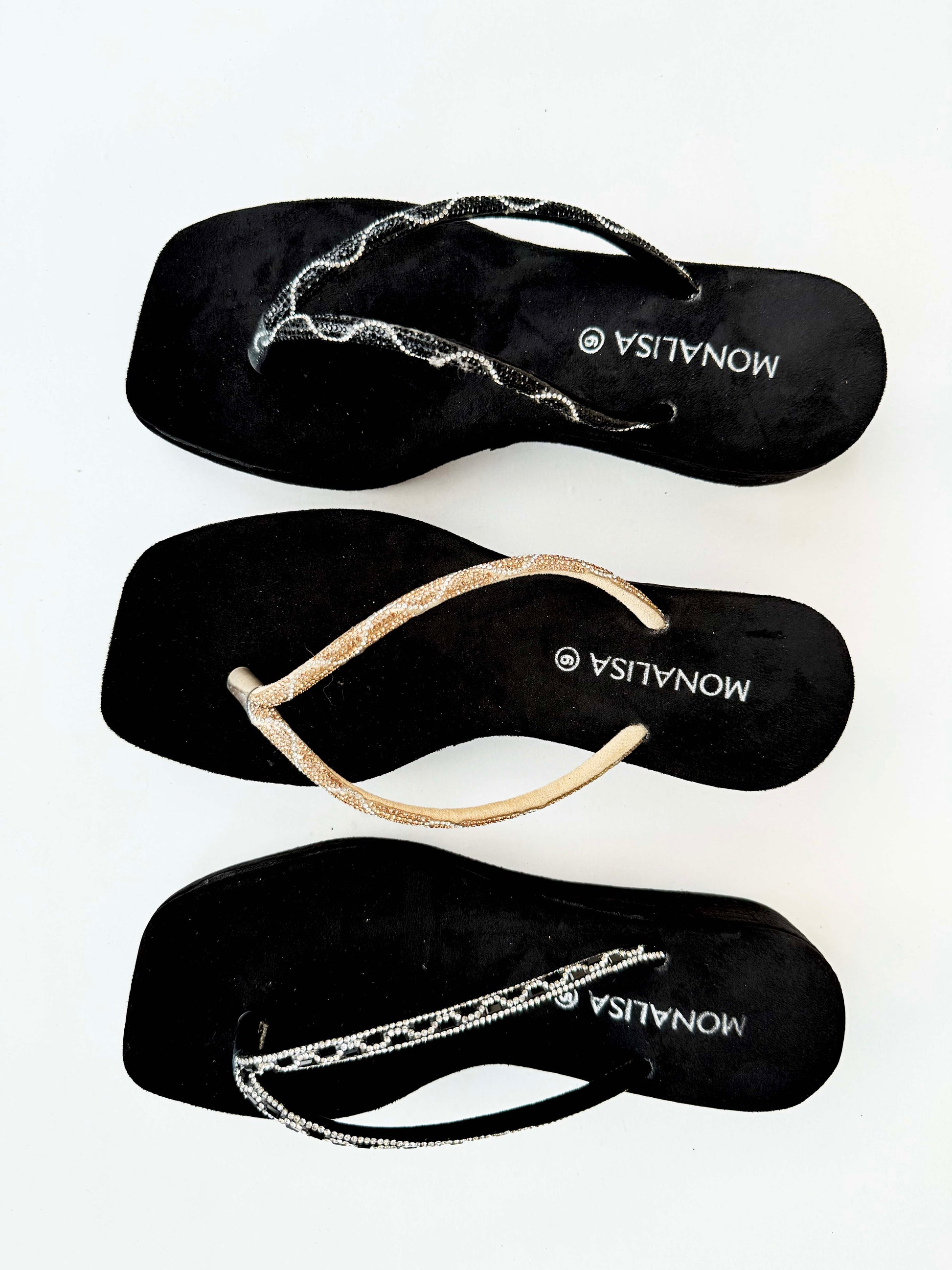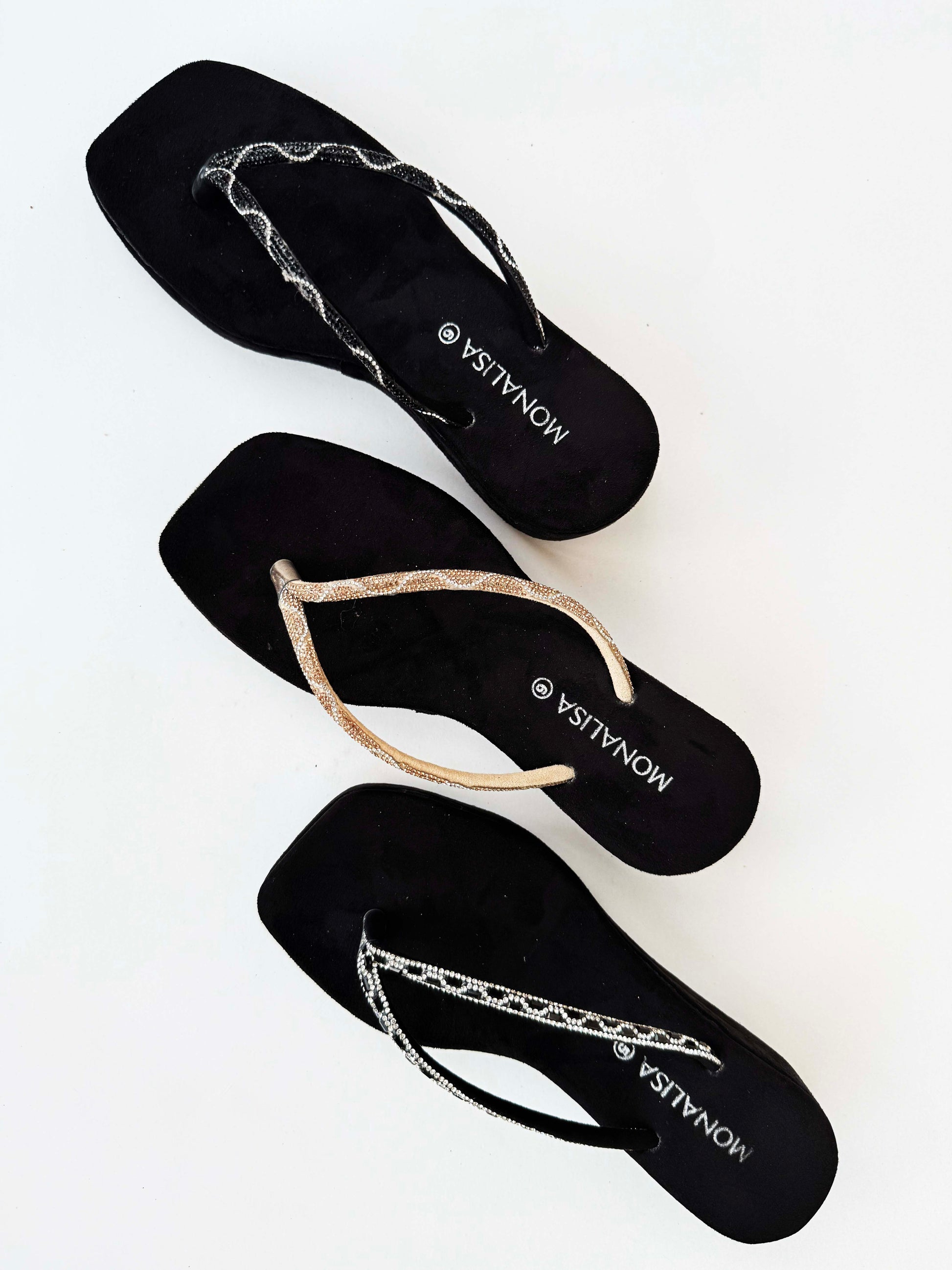 - Embellished Thong Straps: Wavy rhinestone or beaded designs in silver and gold for shimmering appeal.