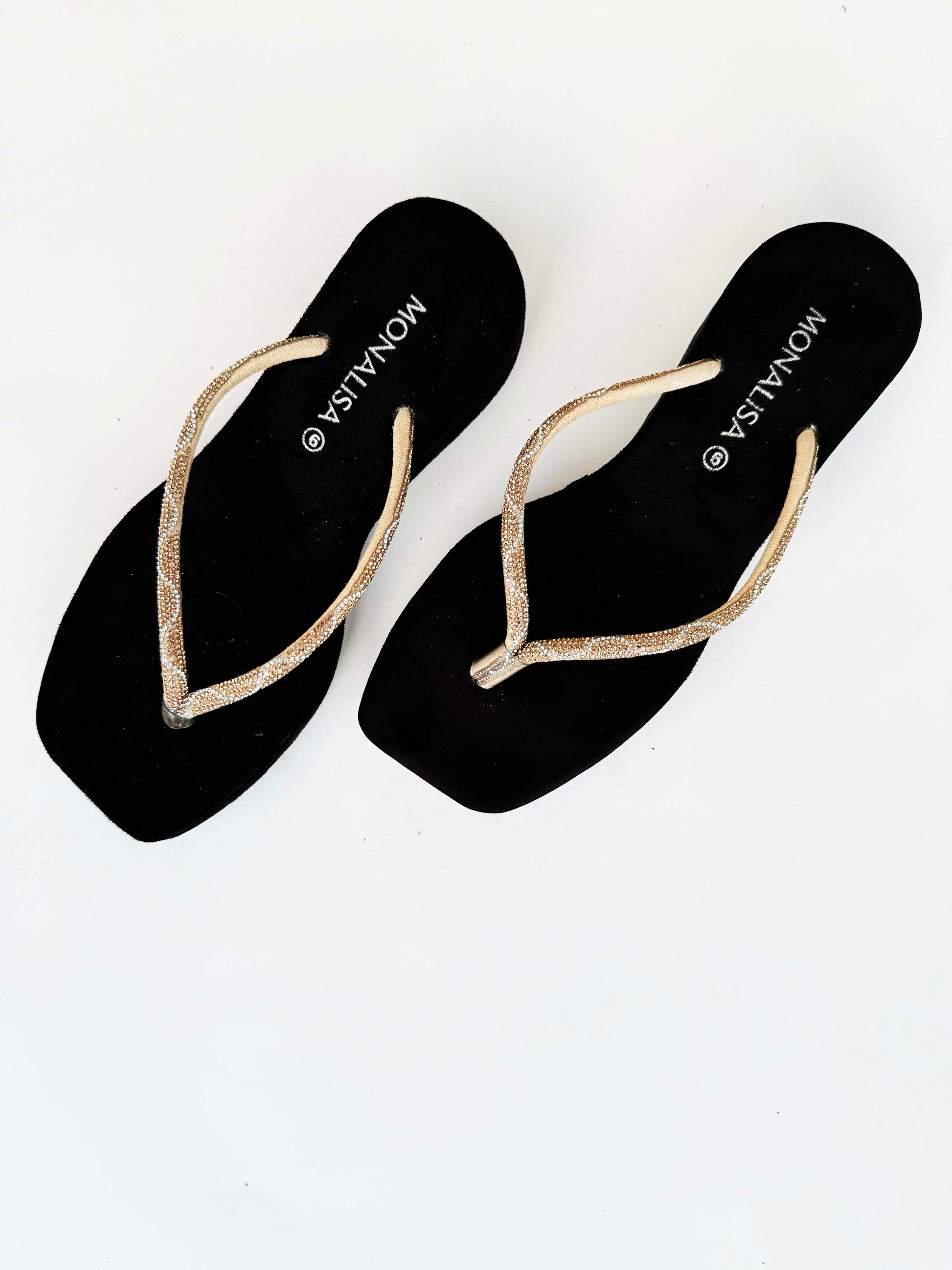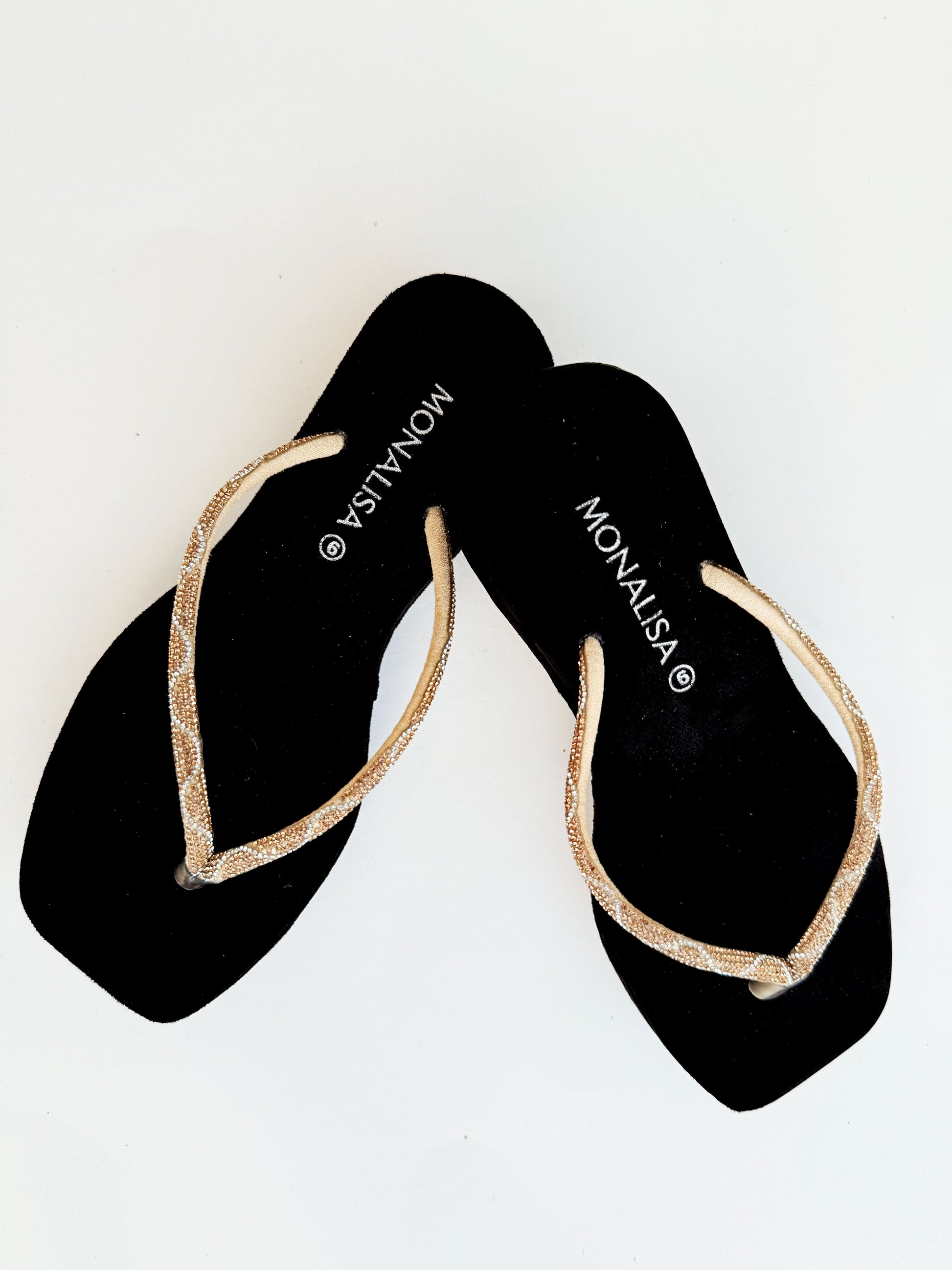 Women's Black Gold Beaded Thong Sandals - Sparkly Flat Flip Flops
