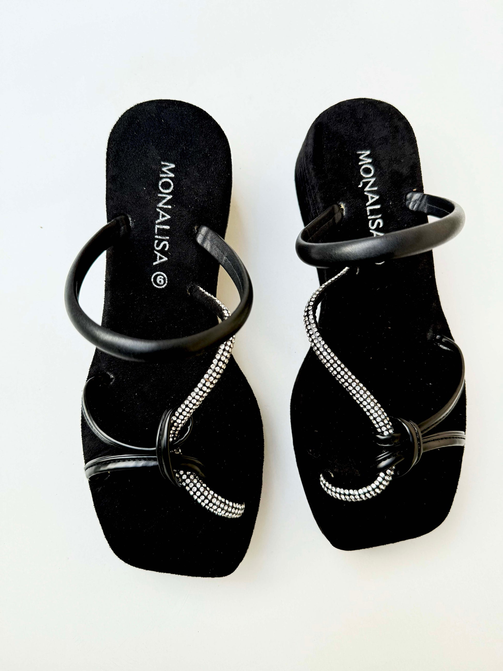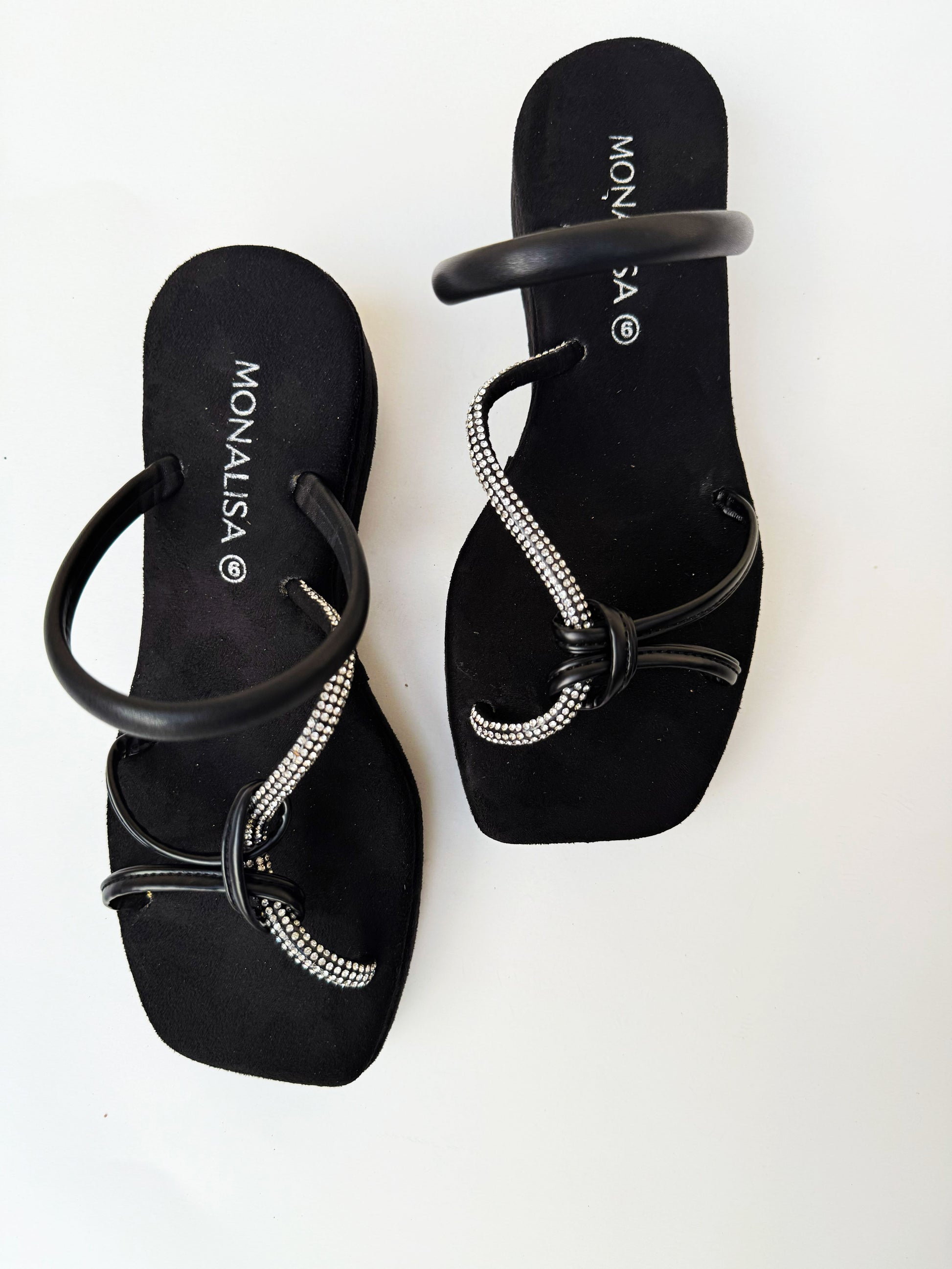 Add a sparkle to your step with these glamorous Women's Black Rhinestone Strap Sandals from Monalisa Premier. Perfect for the woman who loves a blend of sophistication and shine, these flat slingback sandals feature intricate silver rhinestone-embellished straps with a knotted, wavy design that catches the light beautifully. Ideal for evening outings, casual dates, or summer events, these open-toe sandals offer a comfortable slip-on fit with a cushioned footbed and slight platform sole for subtle elevation without compromising on ease.