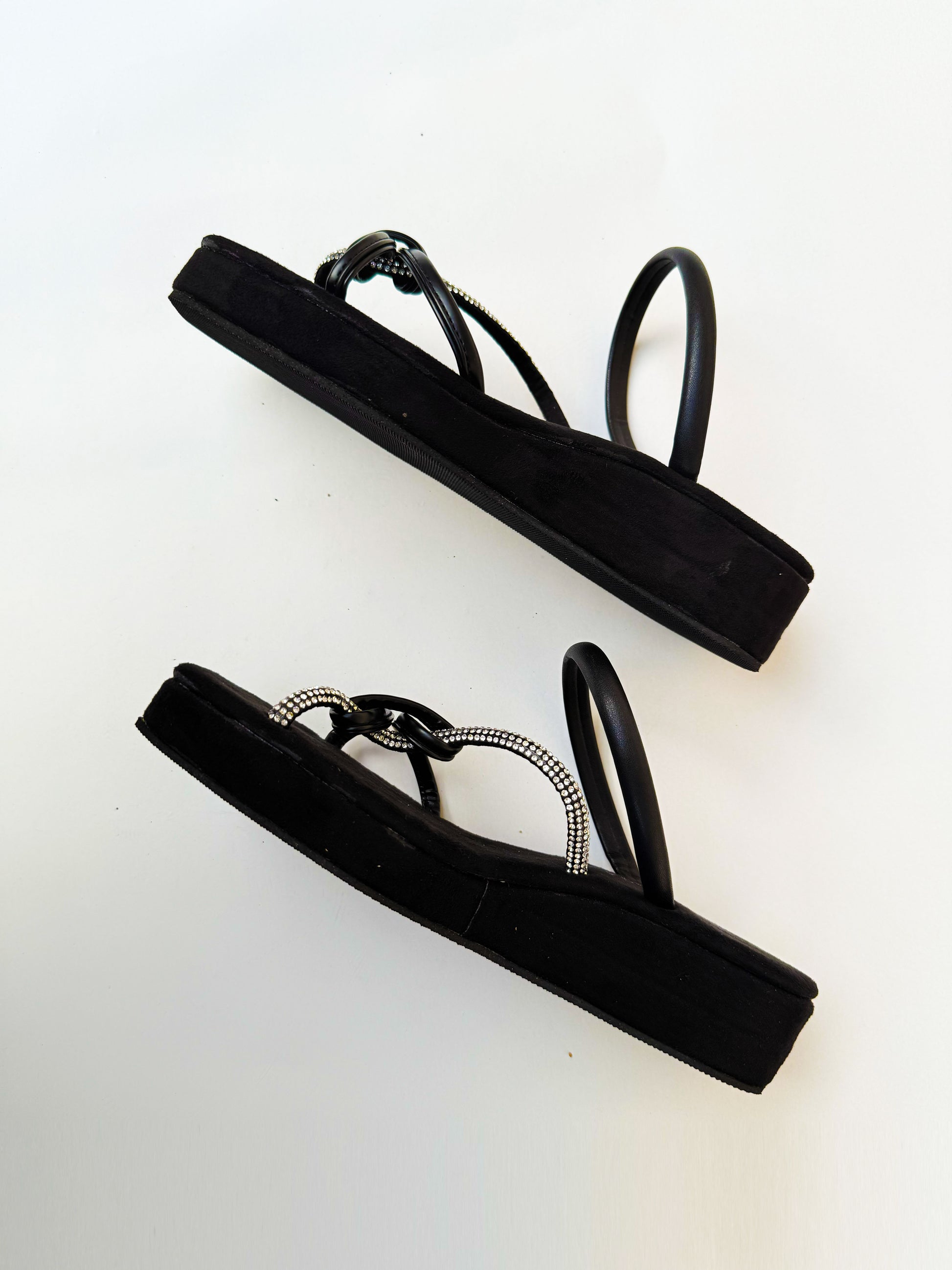 Women's Black Rhinestone Strap Sandals - Crystal Embellished Flat Slingback Footwear